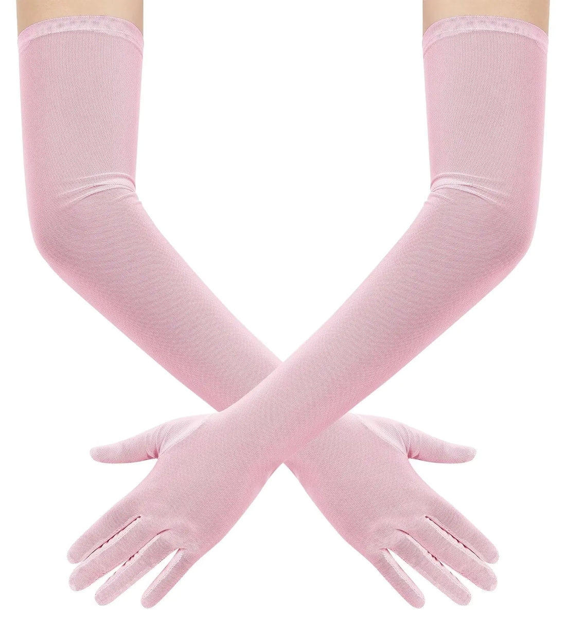 Hazhlko Womens Long Stretchy Mesh Tulle Sheer Gloves Costume Wedding Opera Halloween Party 1920s Dance Gloves Pink