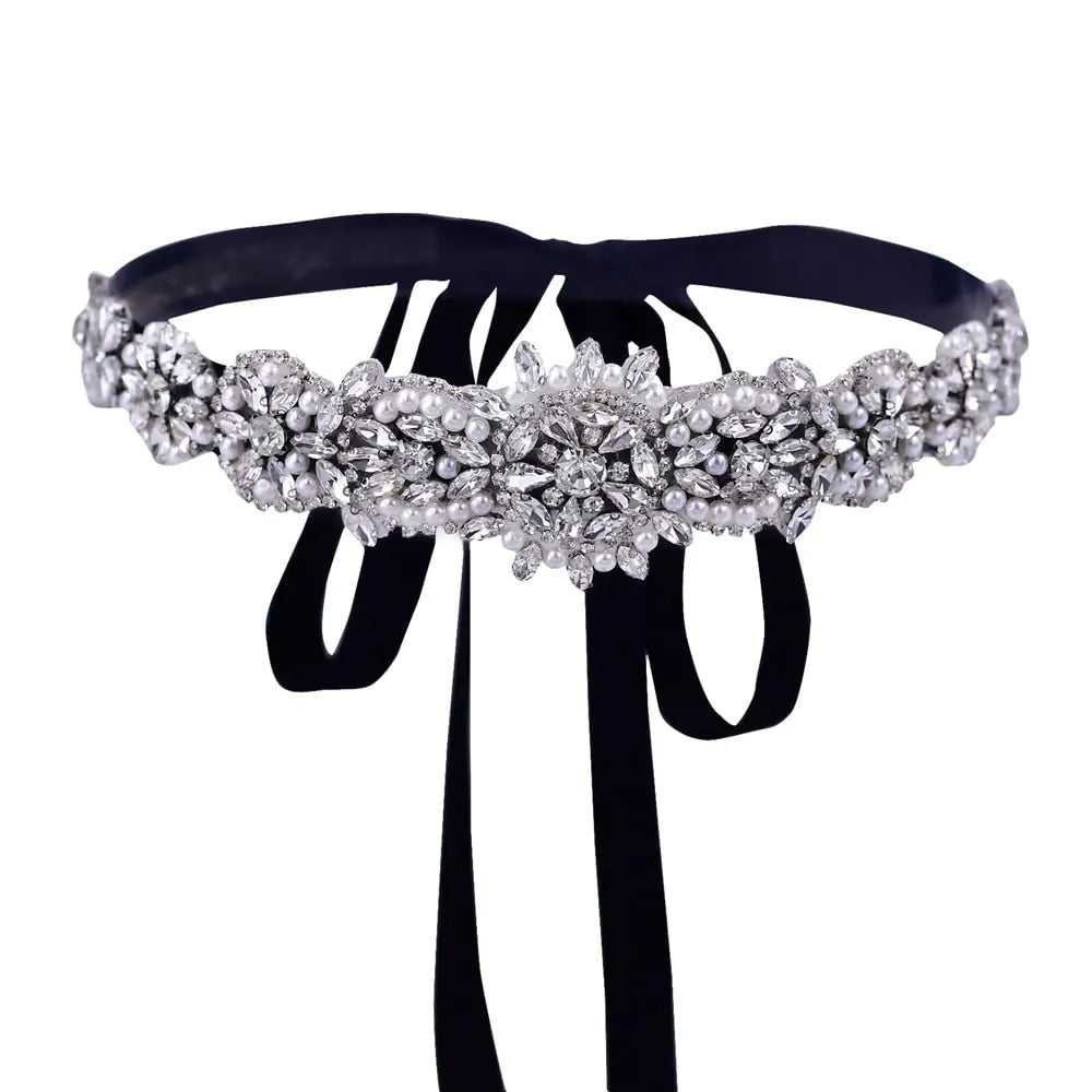 LOVFOIVER Rhinestone Bridal Belt Pearl Crystal Wedding Dress Sash Belt Shiny Handmade Wedding Accessories (Black)