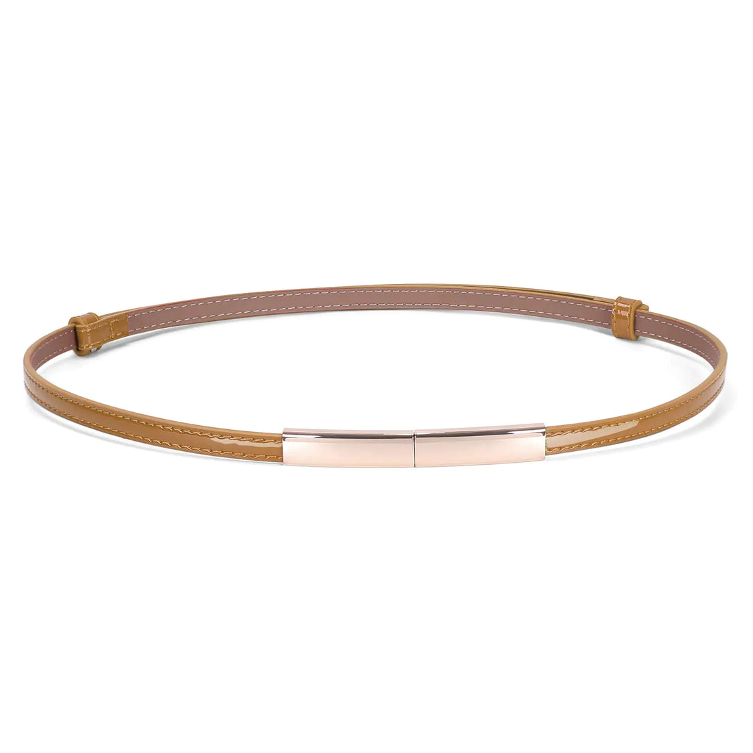 ["Elegant and Versatile Womens Thin Leather Belt: This womens thin leather belt features a gold...