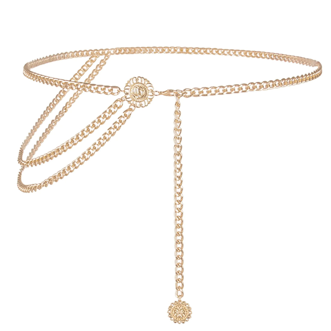 LABANCA Womens Metal Chain Dress Belt Hollow Out Leaf Bead Pendant Sweater Belt Decorated Skinny Waist Belt (06639 Gold)