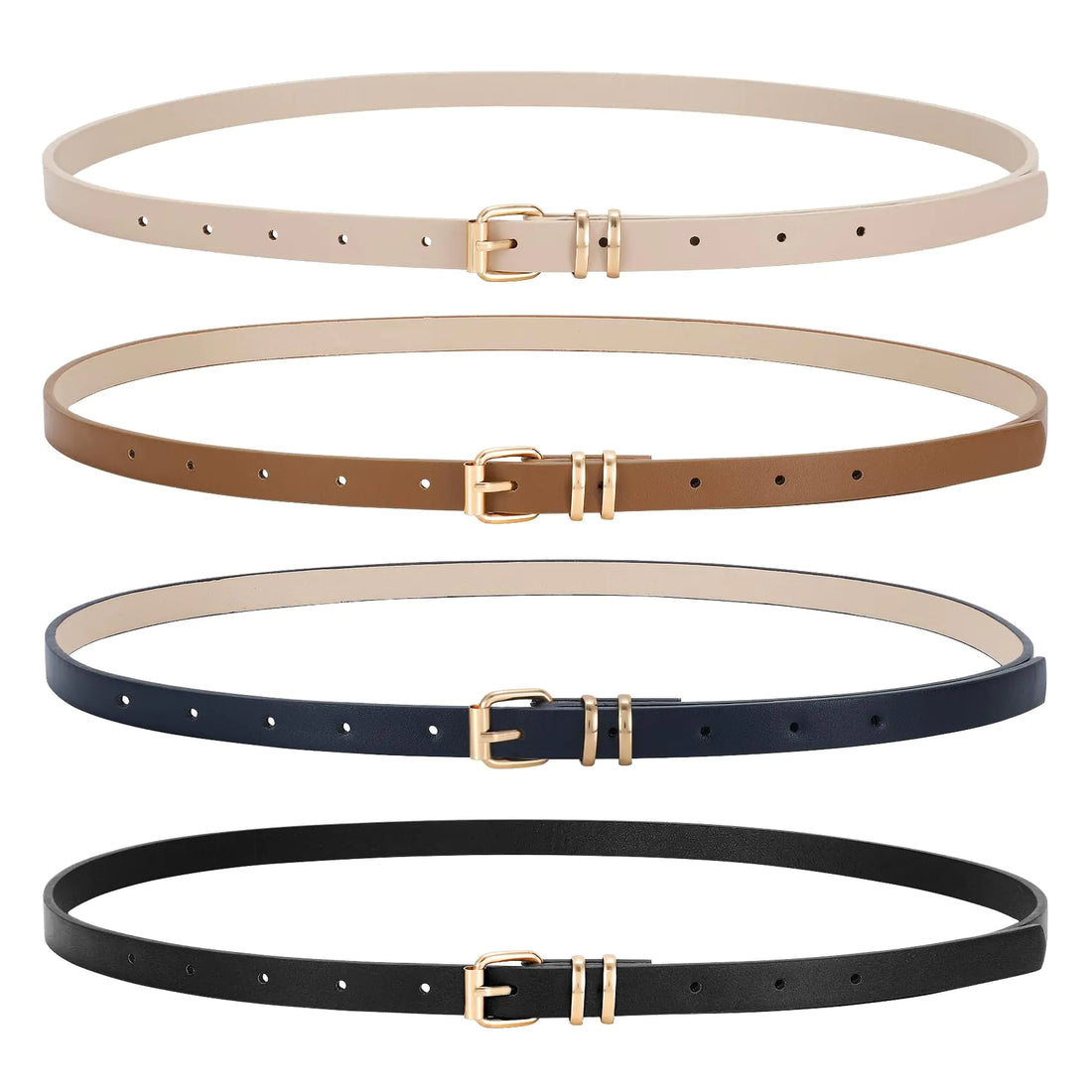 LEACOOLKEY 4 Pack Women Skinny Leather Belts for Dress with Gold Buckle Ladies Thin Waist Belt for Jeans Pants