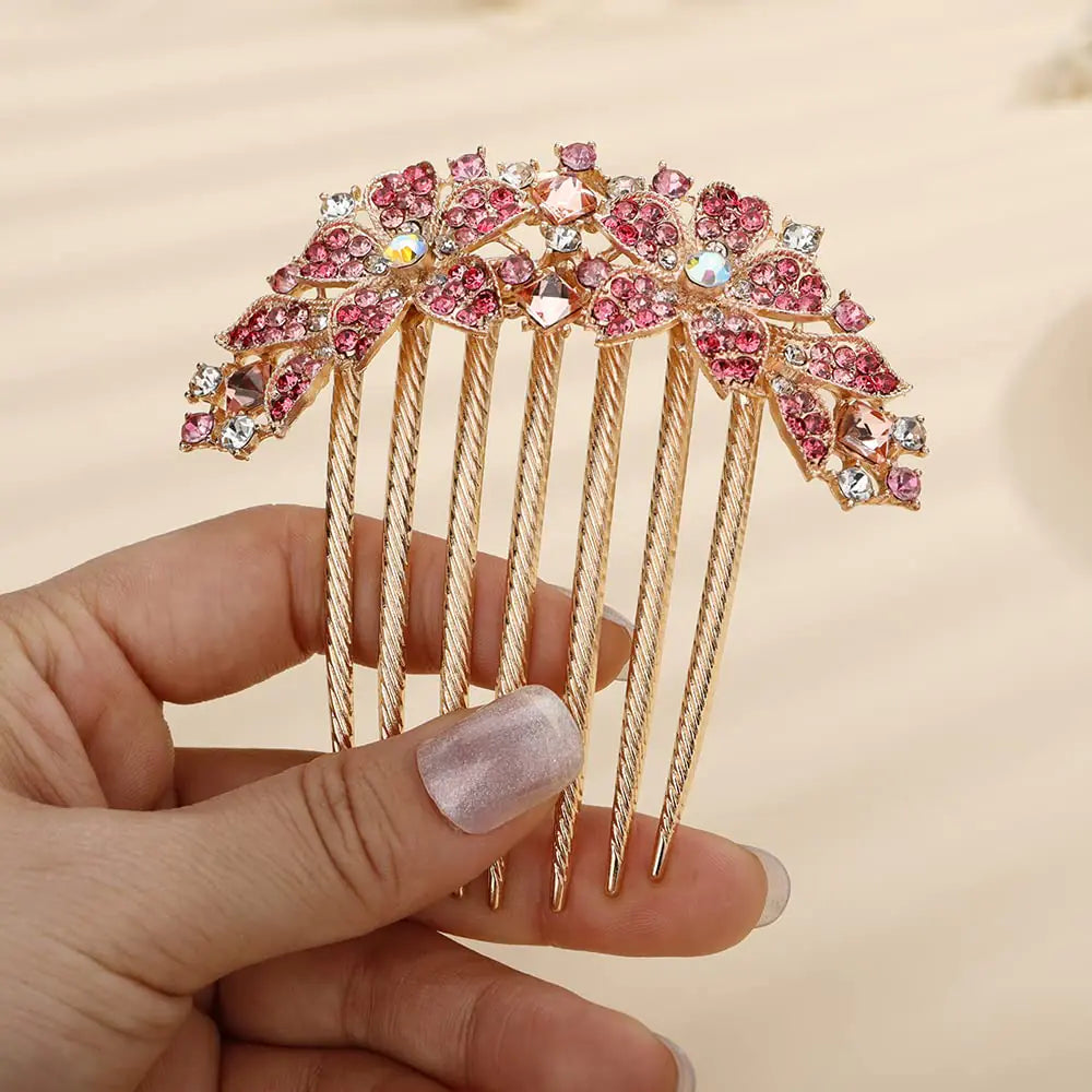 Jumwrit Crystal Bride Wedding Hair Comb Leaf Colorful Rhinestone Flower Hair Side Comb Gold Hair Clip Comb Big Floral Vintage Bridesmaid Headpiece Bridal Hair Jewelry for Women Girls(Pink)
