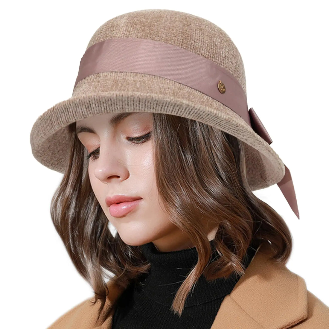 Womens Cloche Hat Winter Knit 1920s Vintage Bucket Bowler Hat with Elegant Bowknot Warm Hat