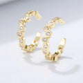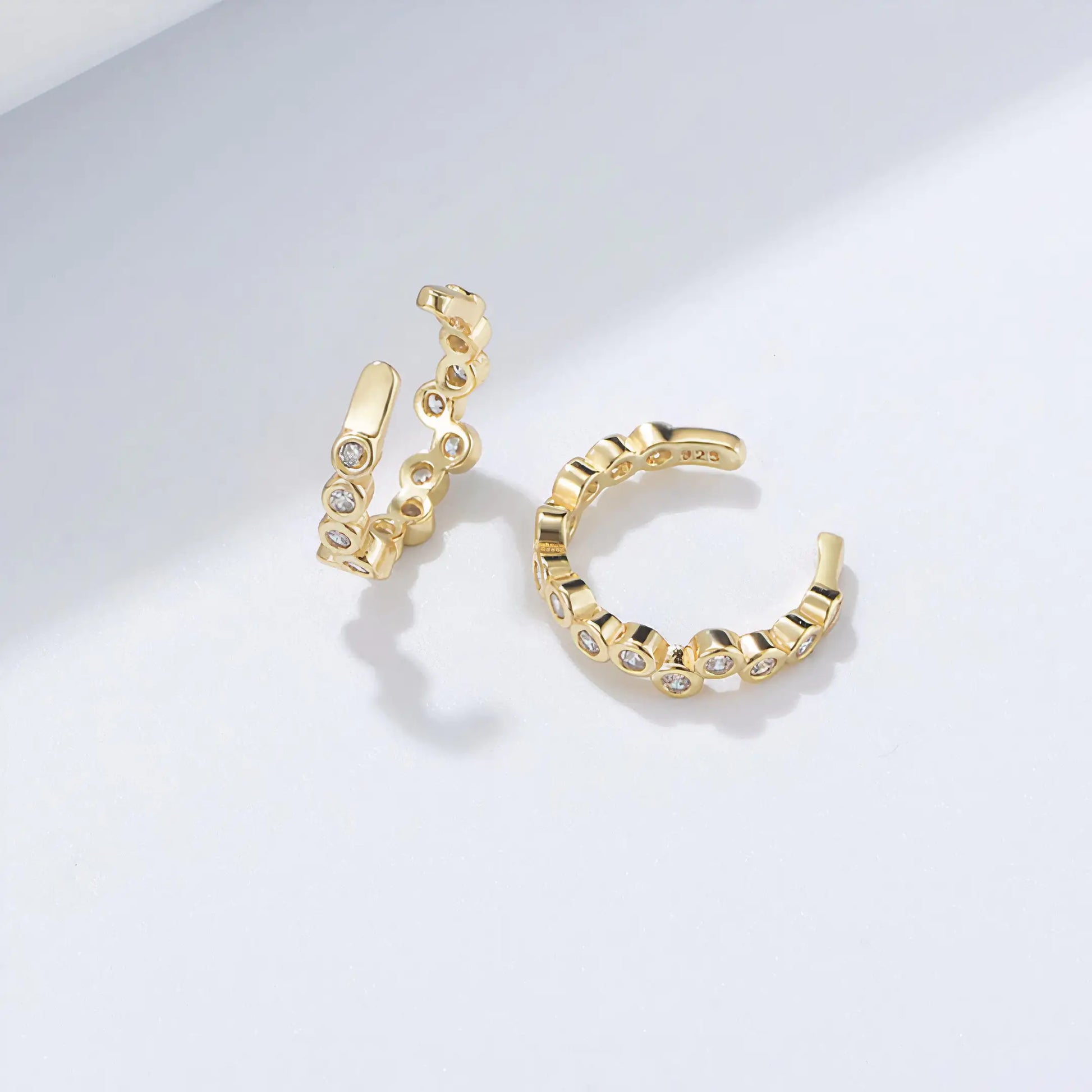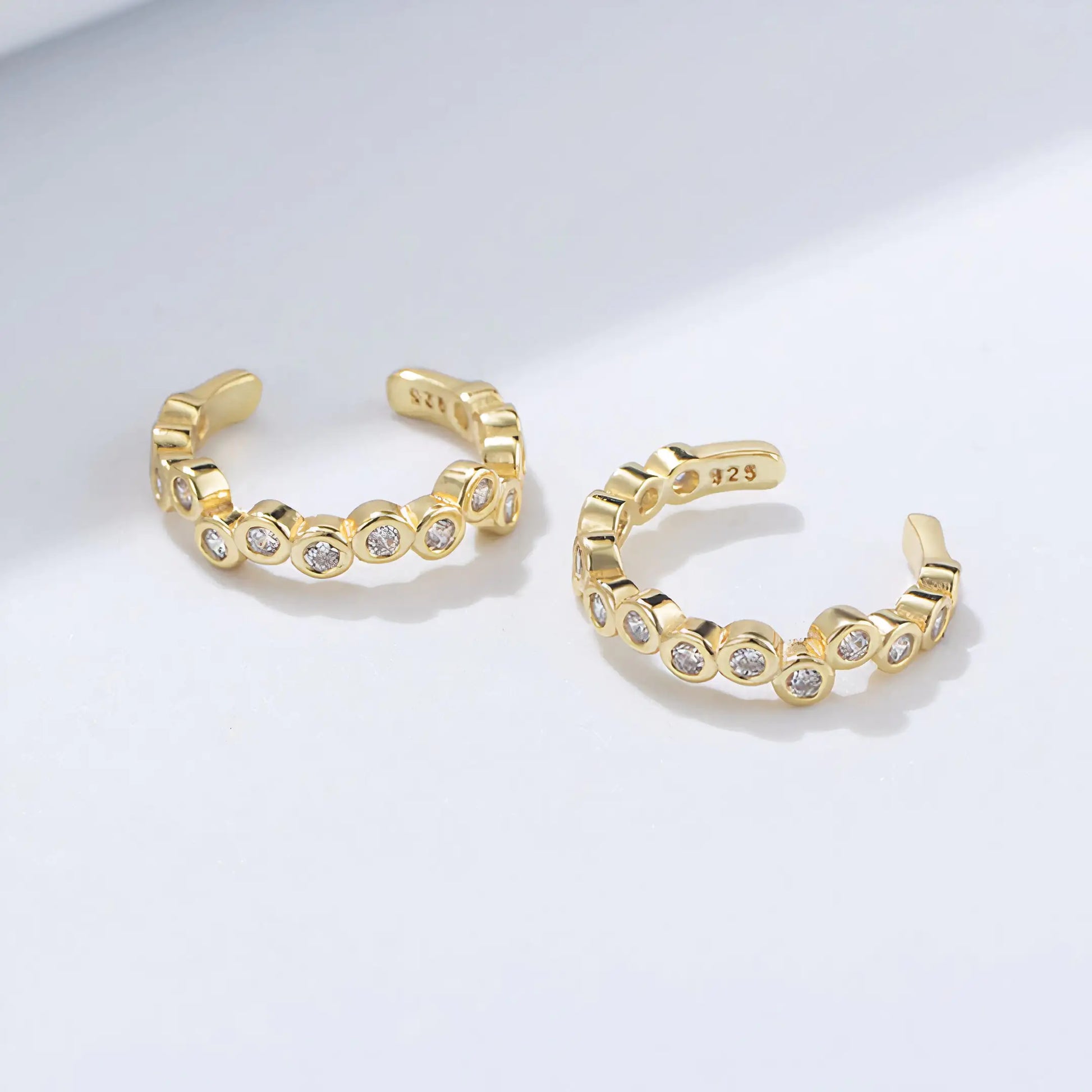 Like a new twist on an old favorite, the Adele Ear Cuff Set features an irregular arrangement of round Cubic Zirconia that will attract all eyes. Hand-crafted using 18K gold plated sterling silver.