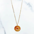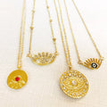 Features a bright red rhinestone inside a carved evil eye on a delicate, adjustable chain. Gold plated.