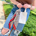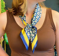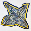 Soft square scarf with beautiful print. Geometrical clover pattern with coordinating colored edge, so chic and edge! Makes great style around the neck, hair, waist as a belt, purses, endless styling uses!