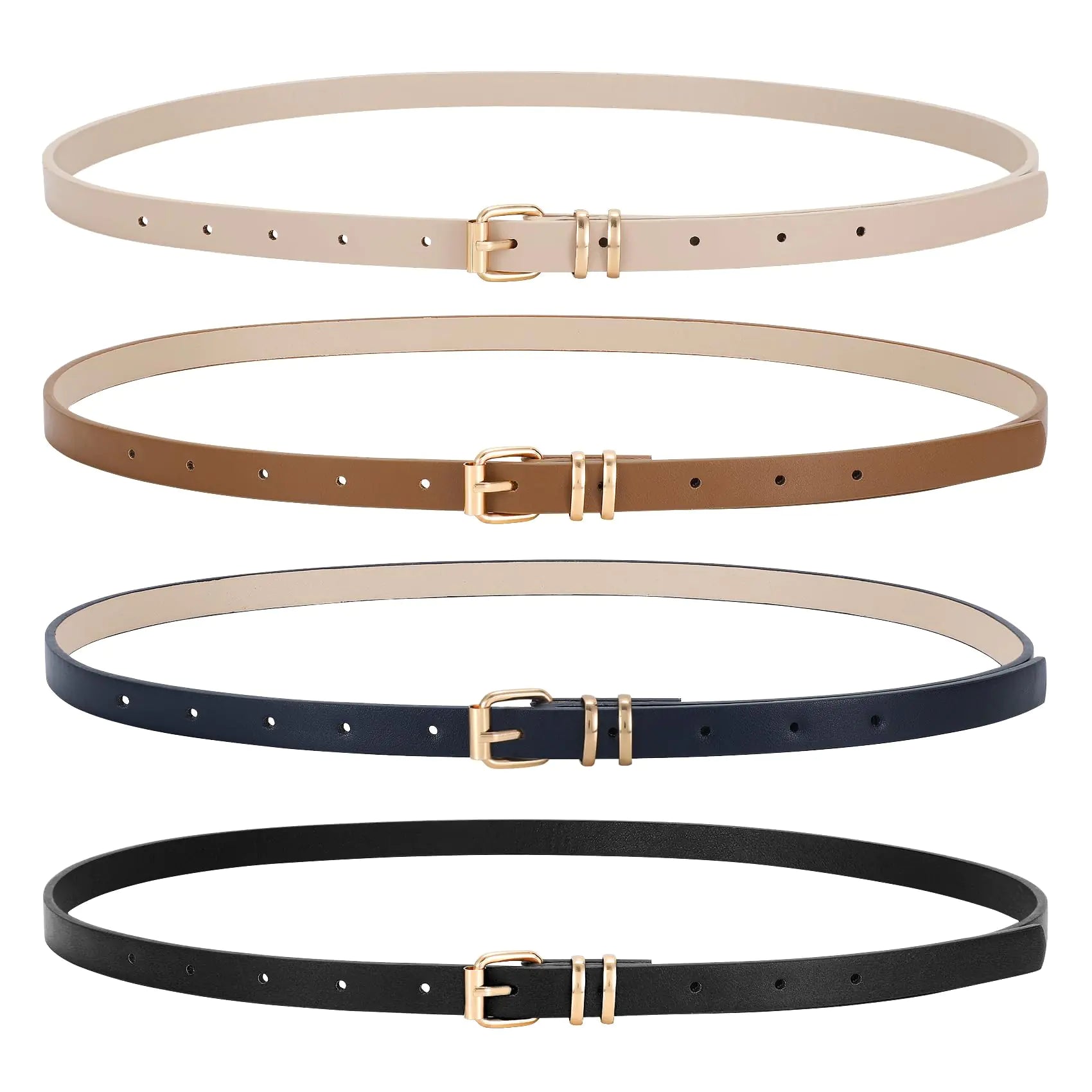 [🌻Premium Quality Materials: These women skinny leather belts are made of high-quality faux leather. The material is durable and resistant to everyday wear and tear ensuring they retain their shape and luster over time. The slender design ensures a comfortable fit without adding bulk. "🌻Versatile Set: Offered as a set of four each women thin waist belt boasts a unique hue ensuring theres a perfect match for every wardrobe choice. These fashion gold buckle skinny belts provide options for daily wear or special occasions making them a versatile addition to your accessory collection." 🌻Elegant Design: The exquisite and elegant design of the gold buckle adds a fashionable touch to the overall look. The understated elegance of these gold buckle thin belts makes them the perfect accessory for dresses jeans pants coats and all outfits. 🌻Adjustable Fit: The skinny leather belt width 0.55” multiple size available. Each women’s skinny belt comes with a series of precisely placed holes and a secure gold buckle. Our skinny belt has ten adjusting holes allowing you to adjust the size to your exact comfort level. 🌻Stylish present Option: The four-piece set design meeting multiple matching needs at once when purchasing. Giving it as a surprise to friends or family is also a very practical and decent choice. Suitable for birthdays anniversaries Christmas or as a thoughtful present during the holiday season.]