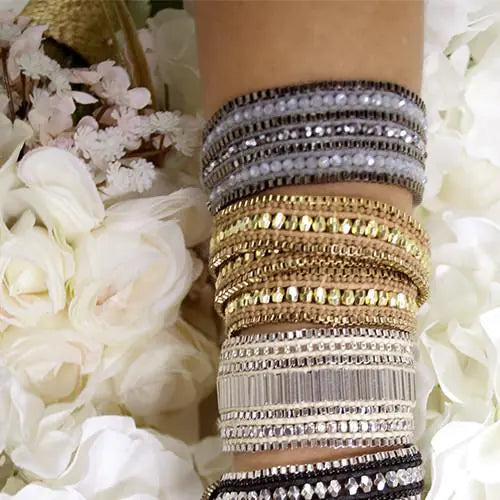 The intricate weaving of this shiny bracelet is like nothing you've seen before. Inspired on the juxtaposition of the bling and the matte, this piece is the ideal hippie chic yet classy weekend look. Adjustable with two size options and finished with a chic metallic button closure.