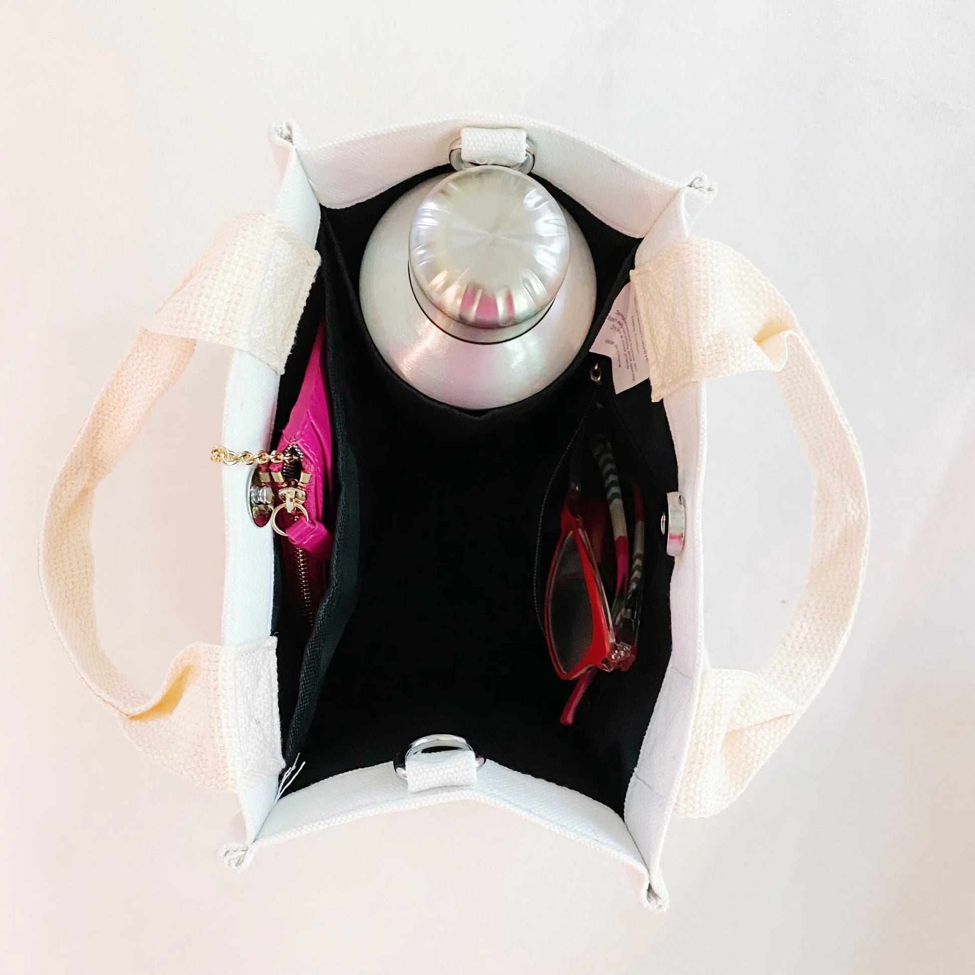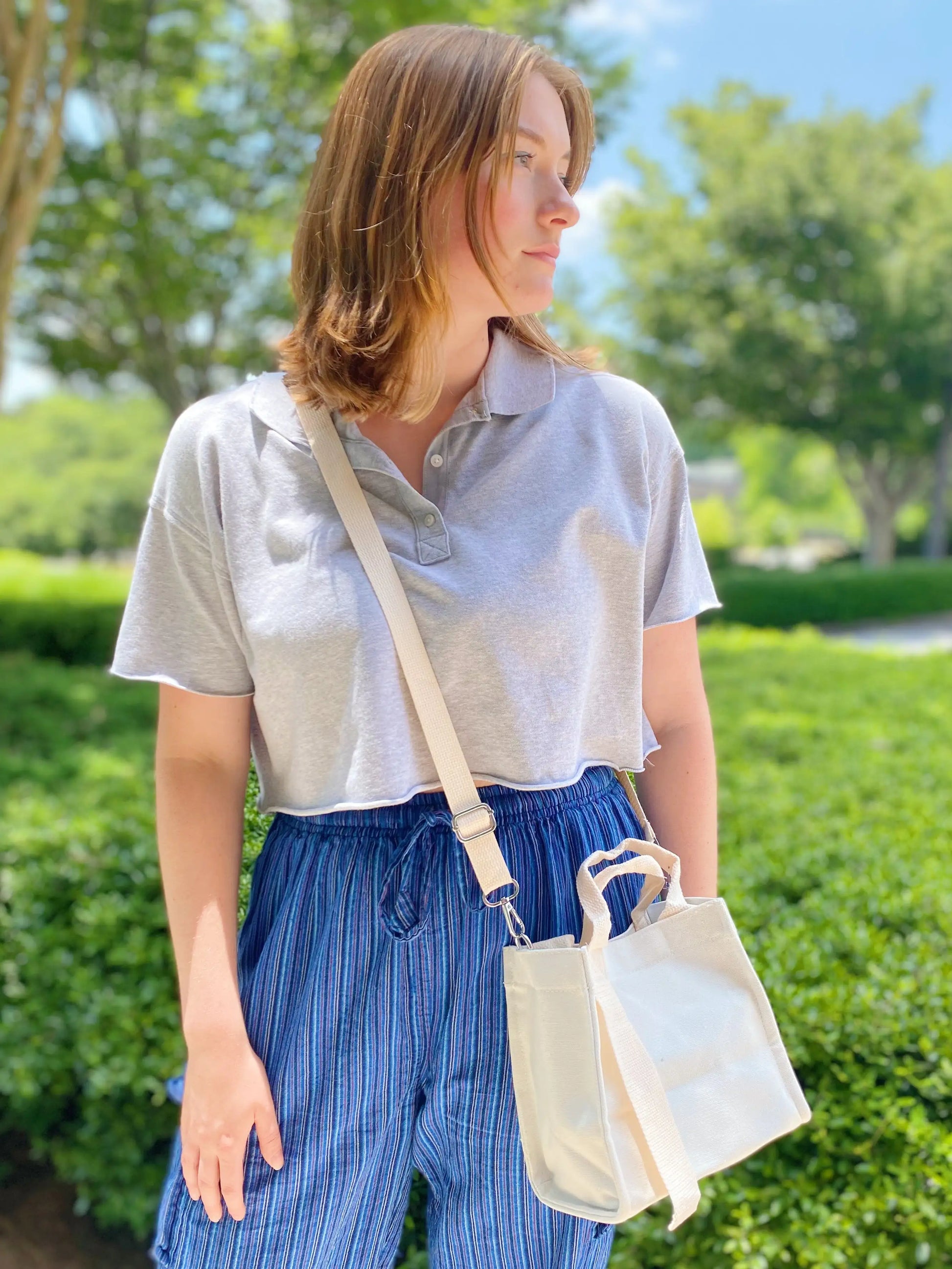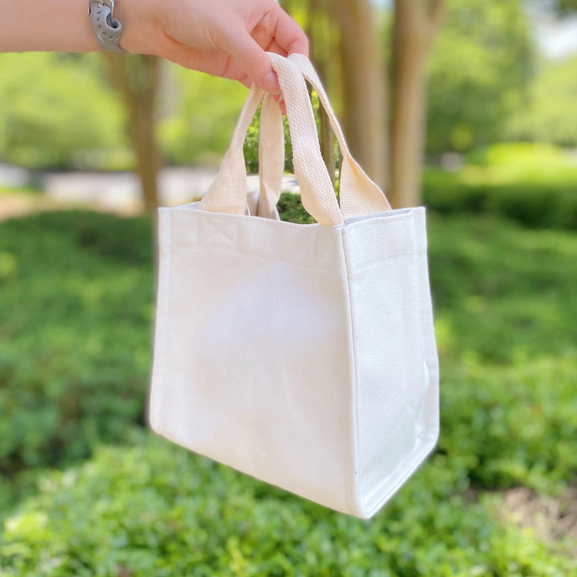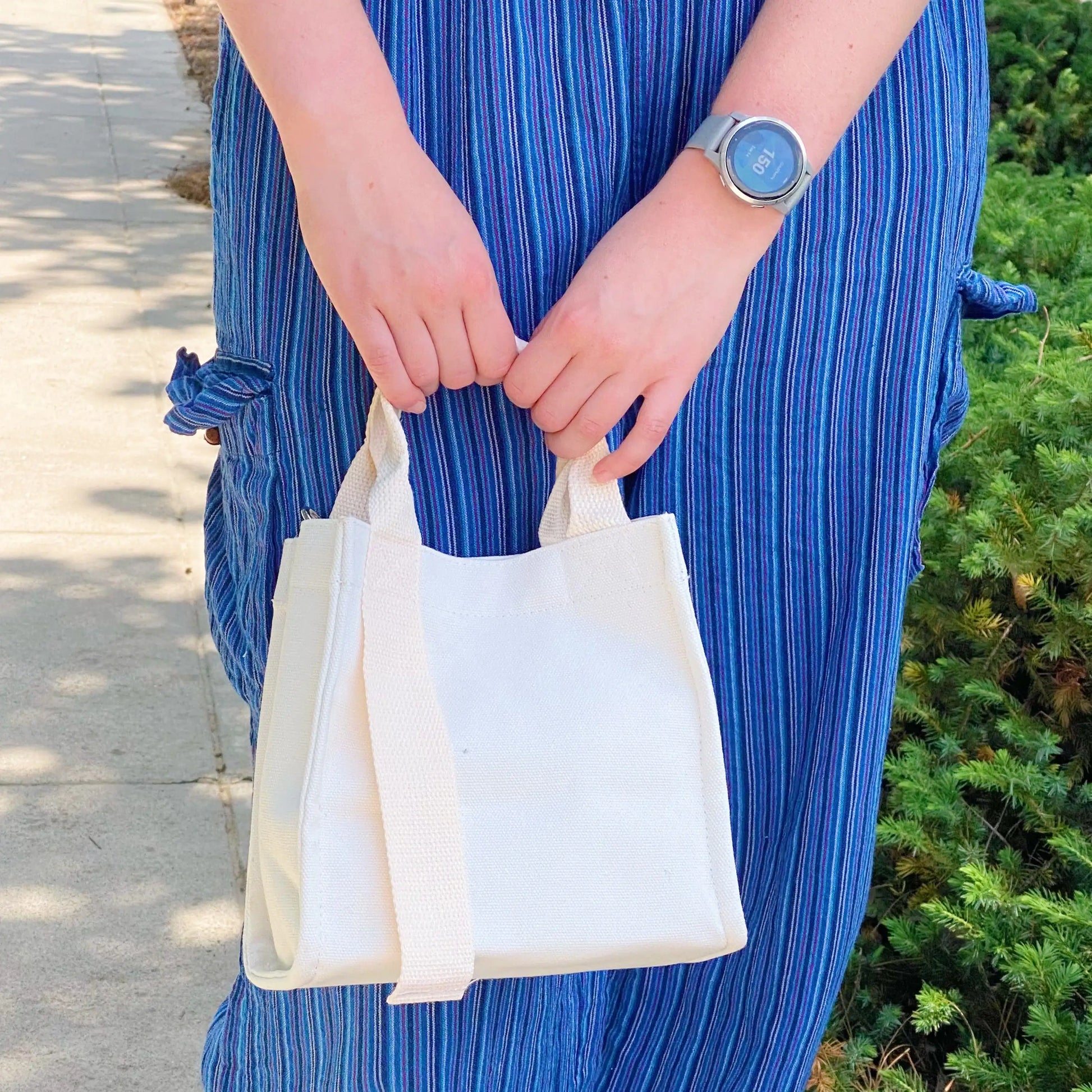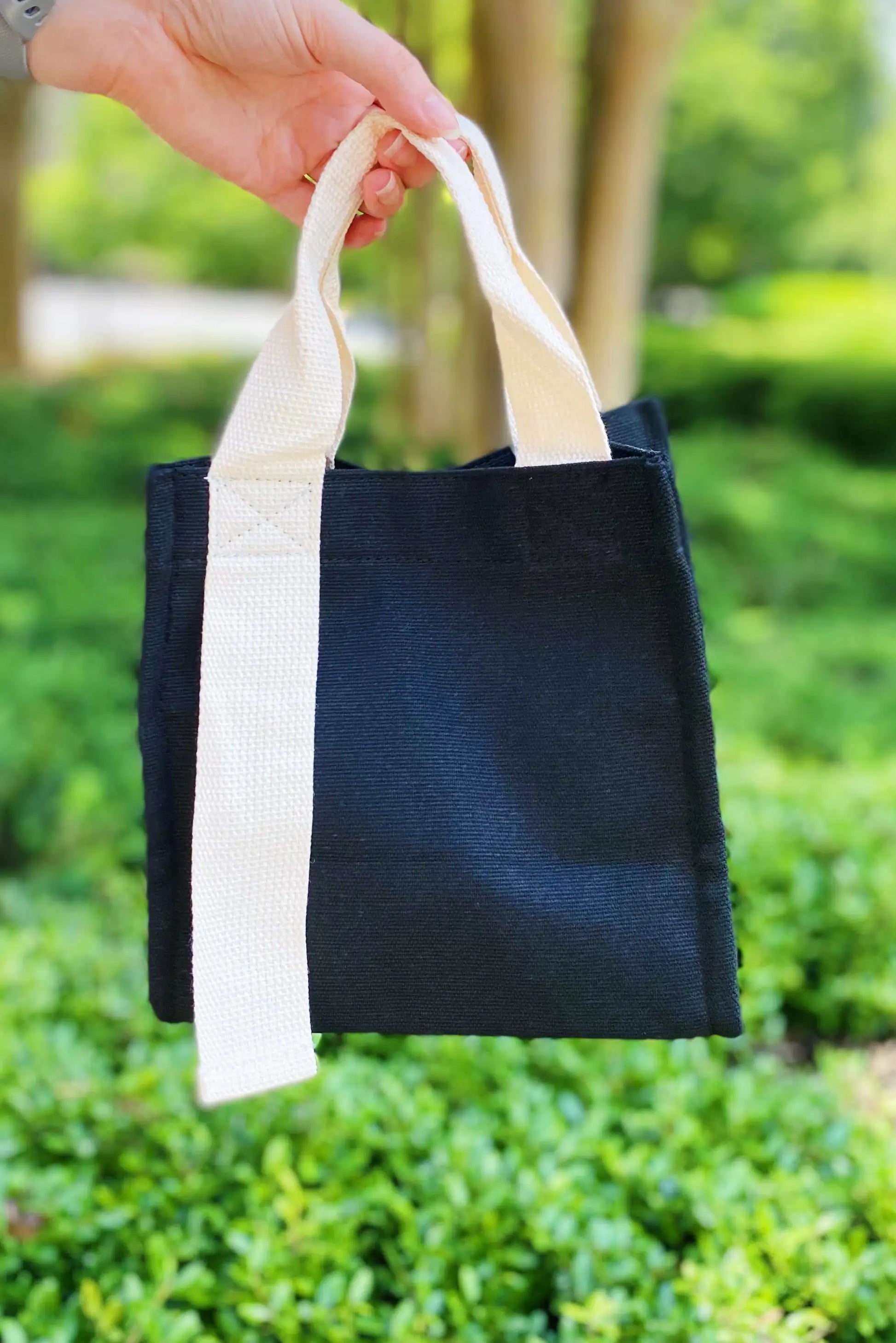 So adorable in this small canvas tote with 2 handles and a detachable adjustable strap.