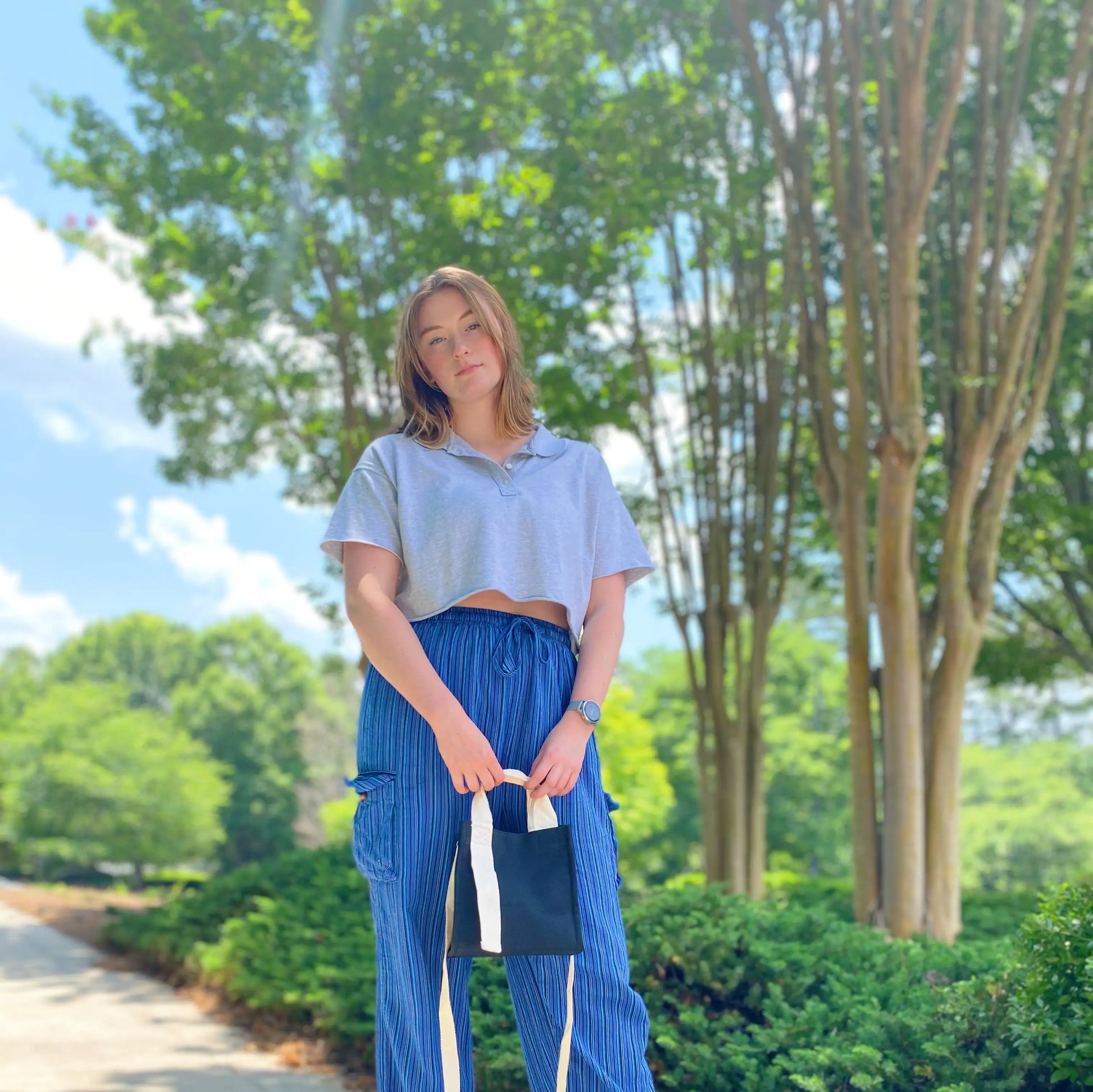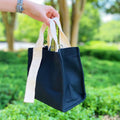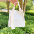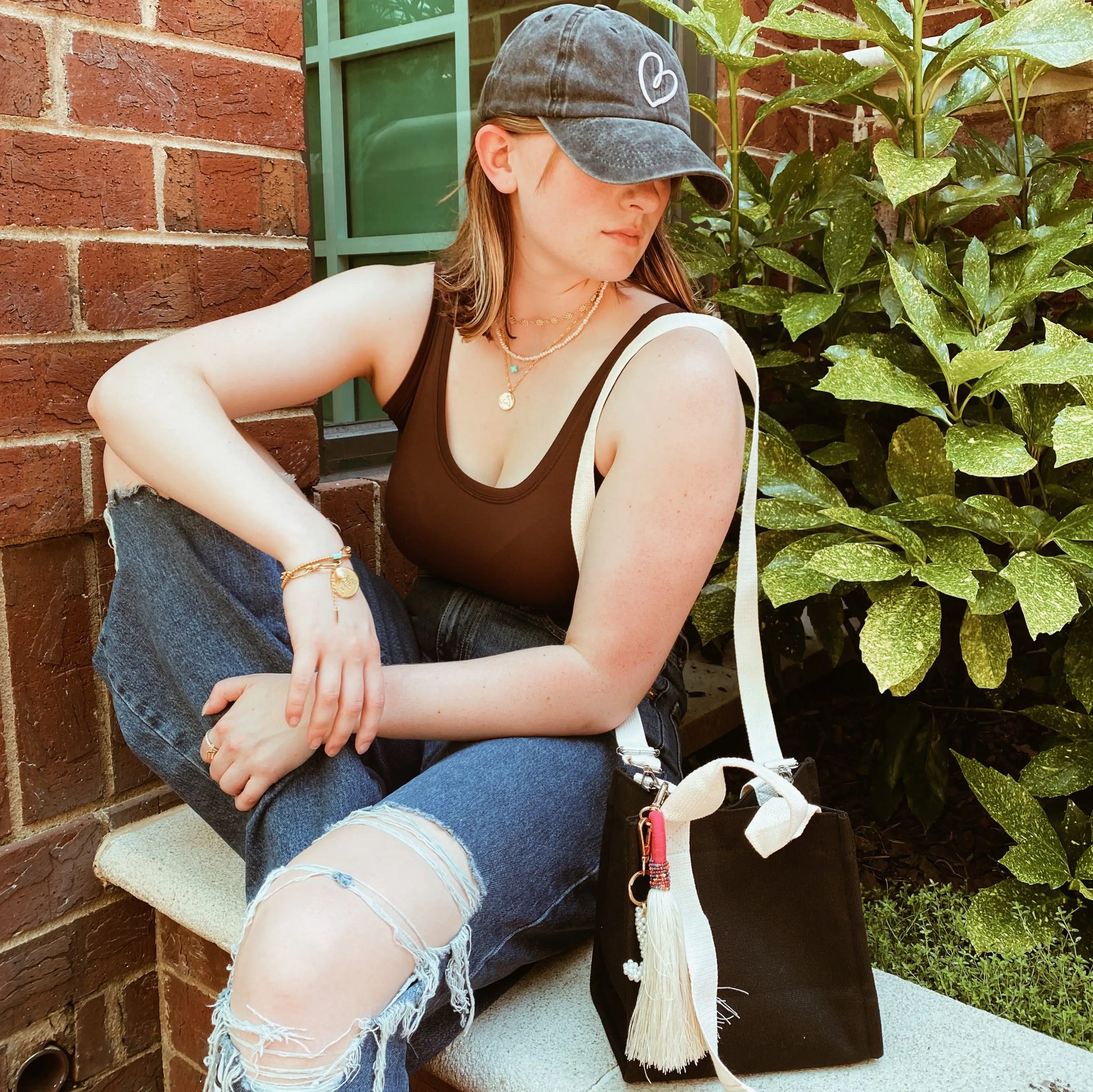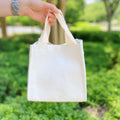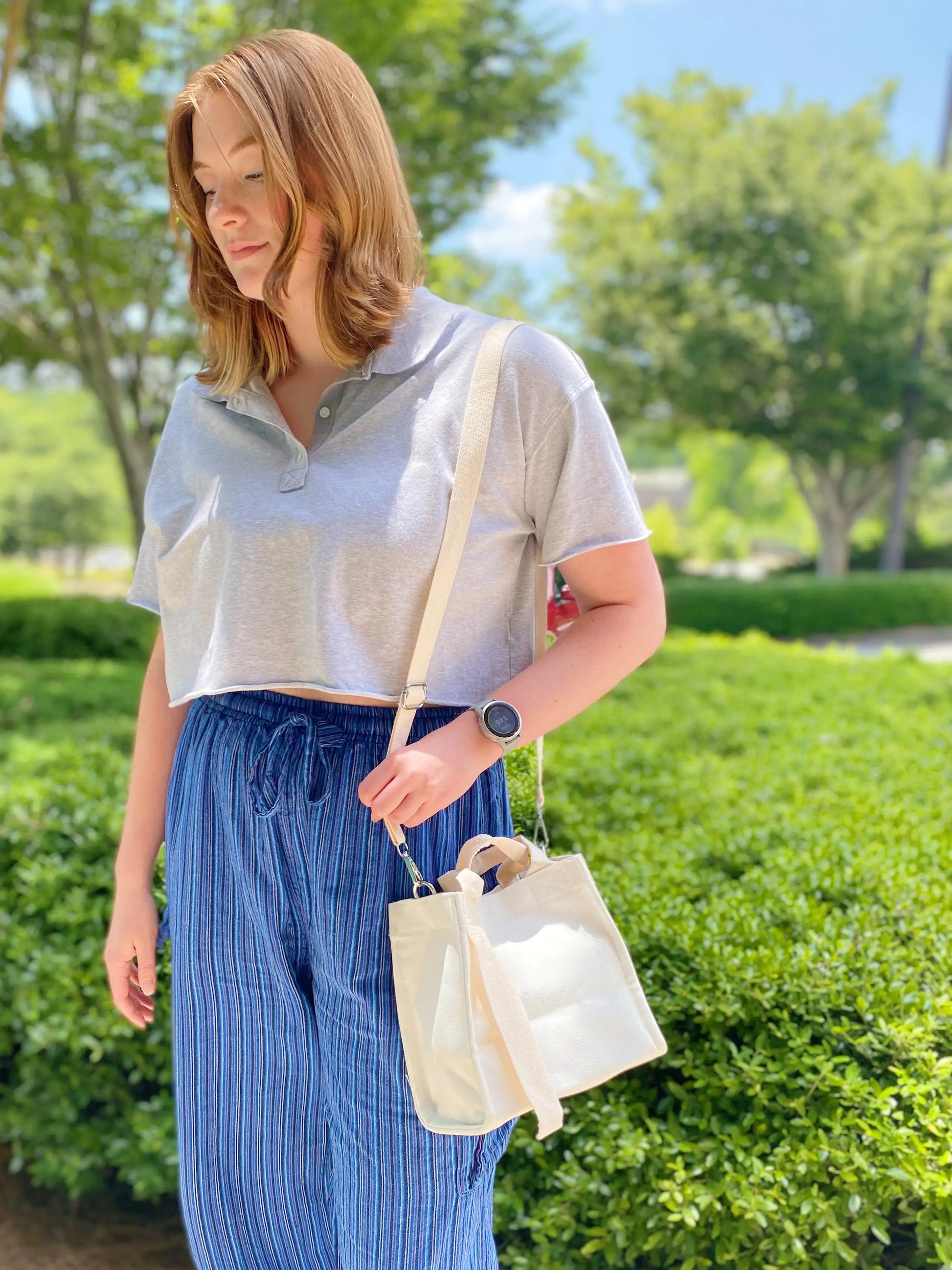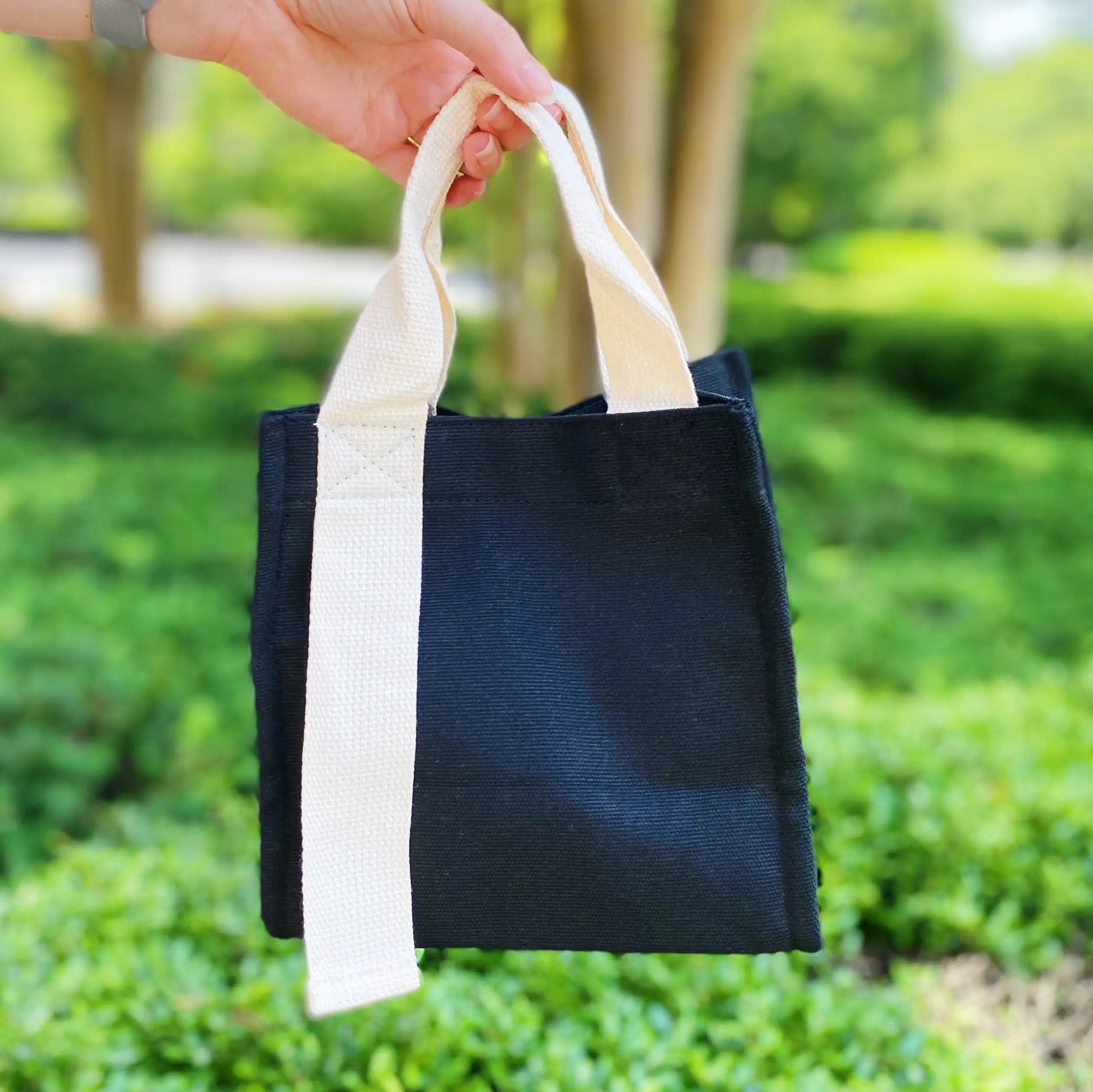 So adorable in this small canvas tote with 2 handles and a detachable adjustable strap.