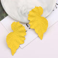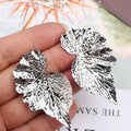 Sturdy metal leaf-shaped earrings that mirror each other.