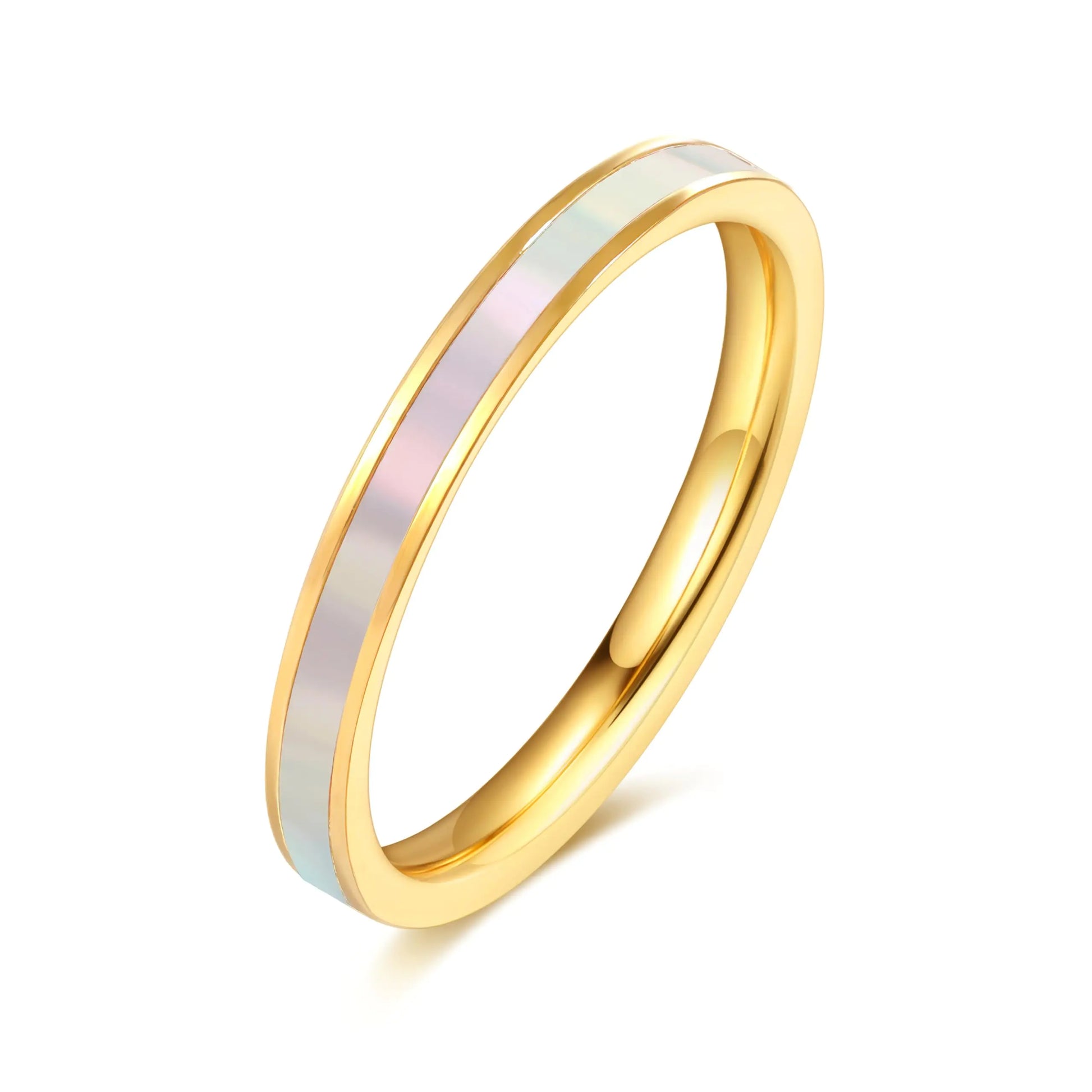 [Design: Mother of Pearl Abalone Shell Inlay Band Ring for Women Pros of Titanium Ring: Thicker 14k gold platedScratch resistantHypoallergenicAnti-fading "Ocassion: Anniversary Valentines day Thanksgiving Christmas New year Birthday Mothers day" Packaging: Simple packagingplease note this ring does not include box but a delicate cute bag Services: Please contact us if you have any question regarding to our product]