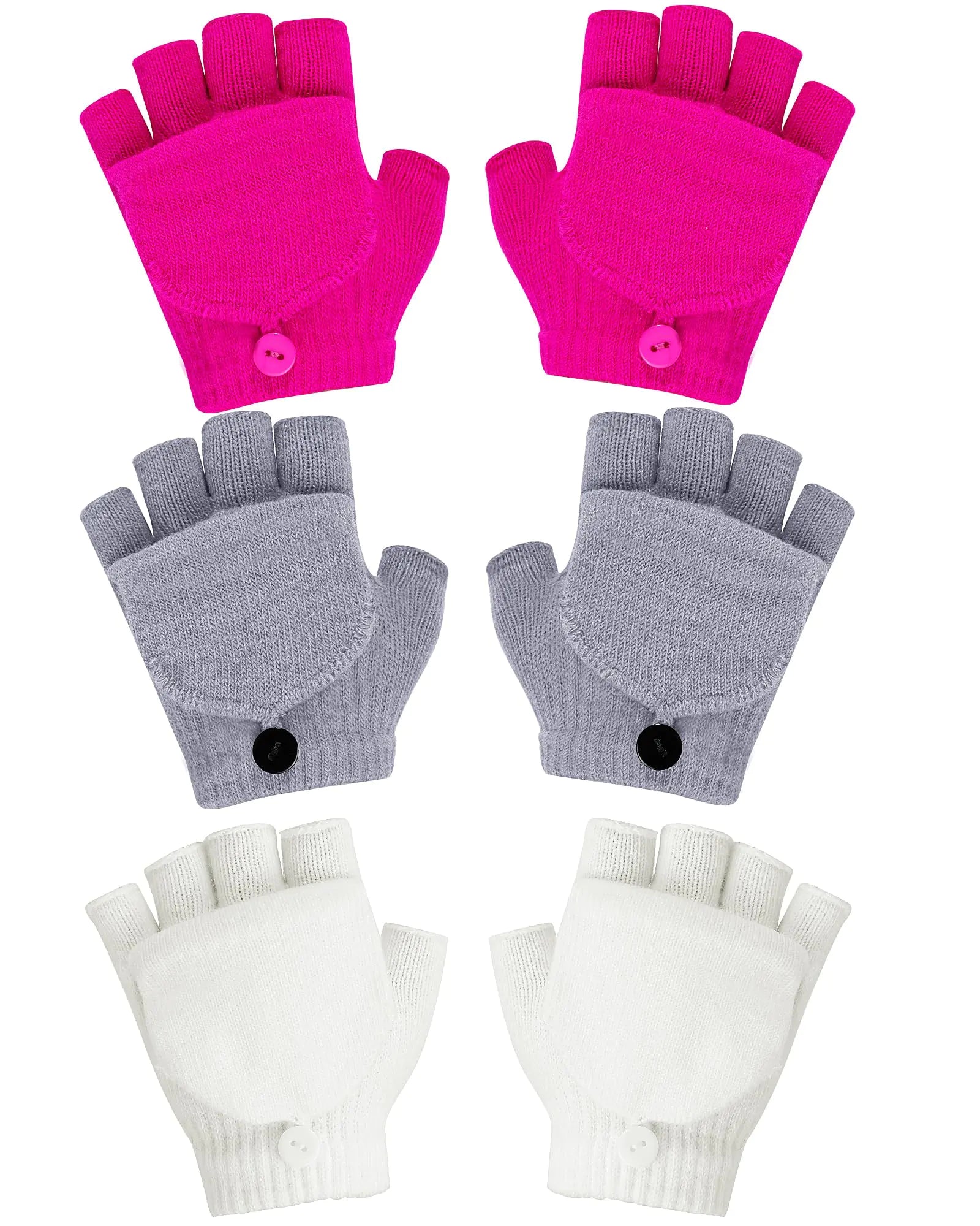ONESING 3 Pairs Kids Fingerless Gloves with Mitten Cover Convertible Knit Gloves Kids Fingerless Mittens for Boys Girls