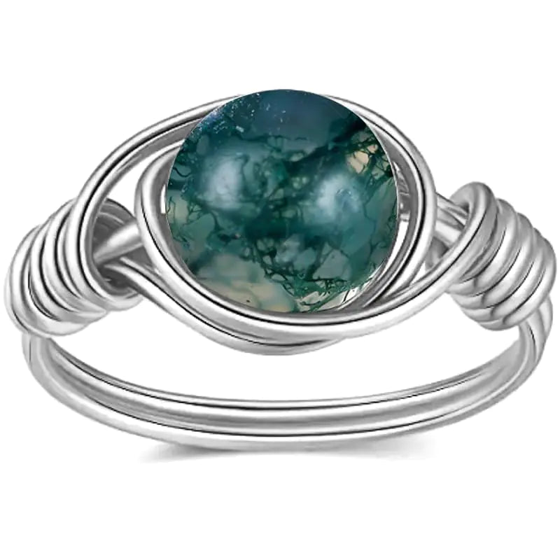 OPALead Natural Moss Agate Ring Handmade Wire Wrap Beaded Braided Ring Ring for Women Jewelry Gift (8 Silver)