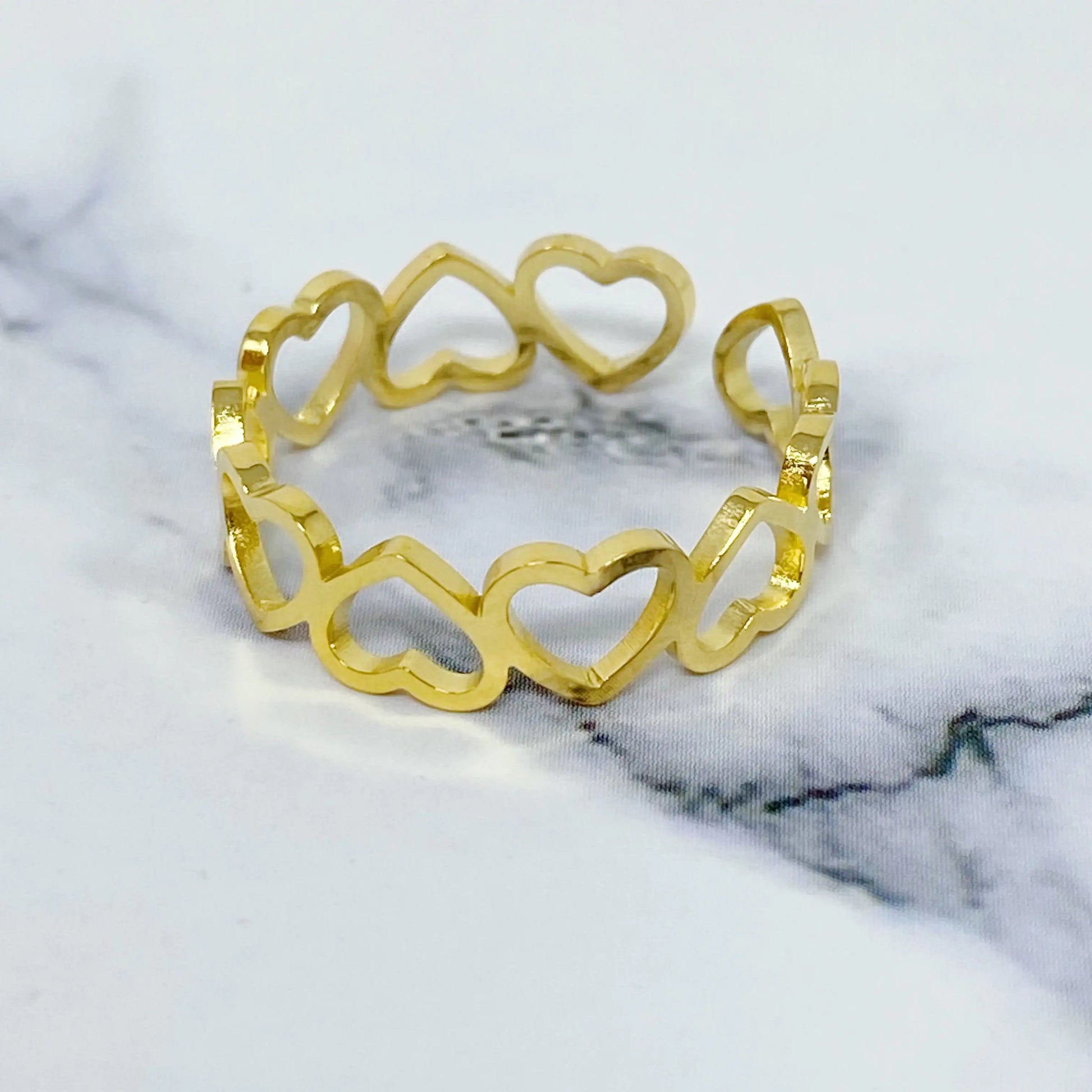 Adorable small open hearts are put together in this band ring! Perfect for everyday wear and great to make different layers with other rings. Open adjustable ring that can be worn any finger that fits and look stylish!