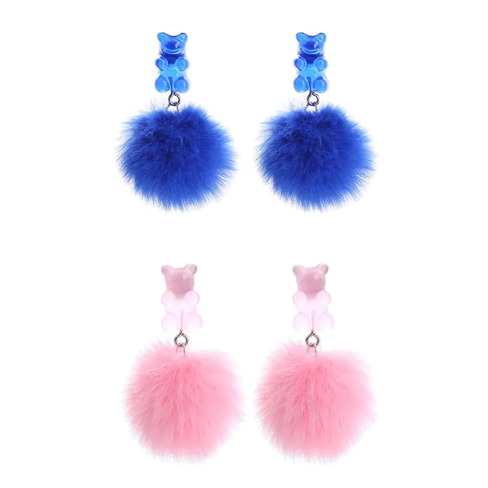 Pom Pom Candy Bear Earrings Fluffy Faux Fur Ball Earrings Gummy Resin Bear Drop Earrings Cute Colorful Ball Resin Bear Dangle Earring for Women (Blue&Pink)
