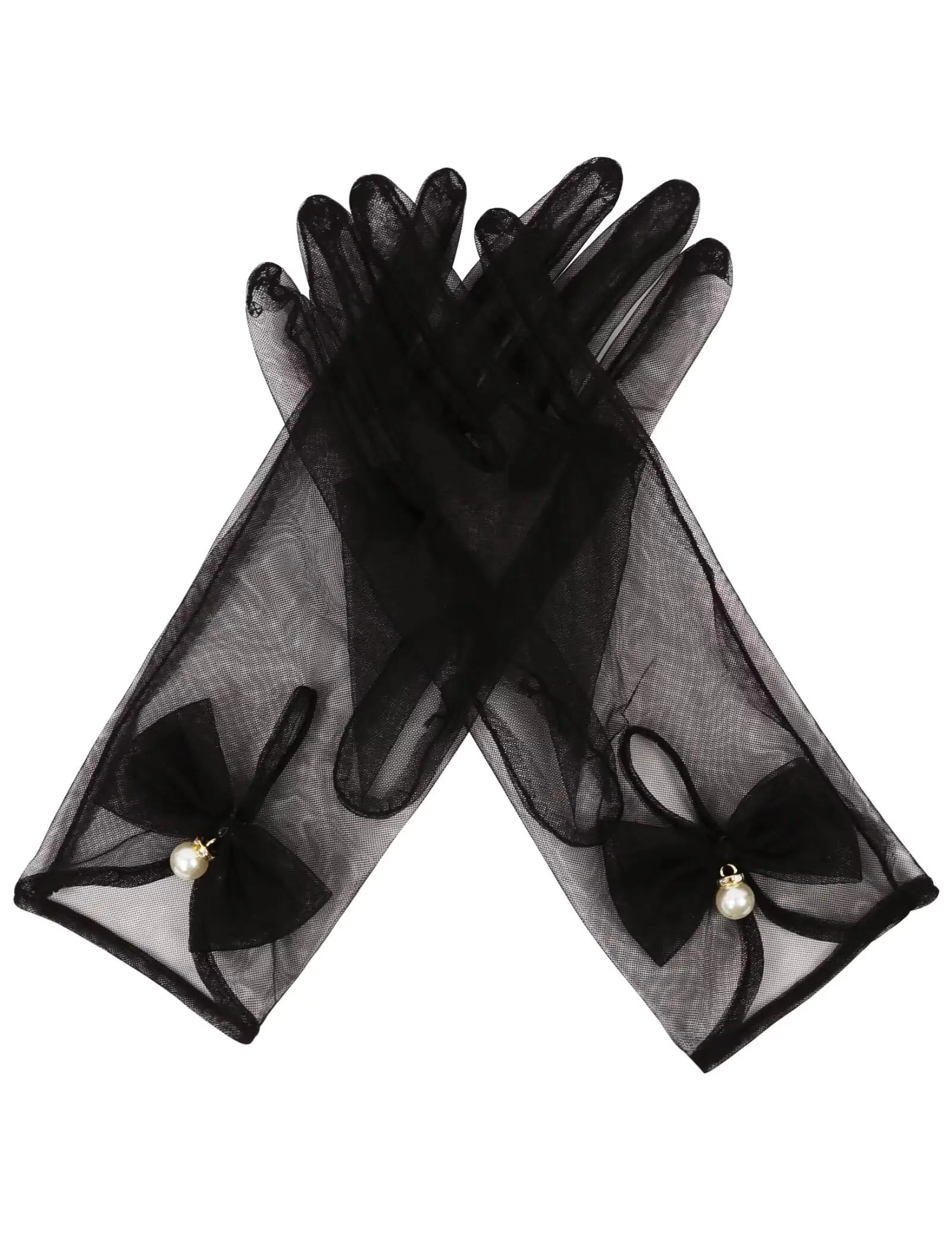 QRBTSCL Womens Bow Tea Party Gloves Sheer Gloves Elegant Mesh Short Gloves Wedding Bridesmaids Prom Evening Opera Gloves Black