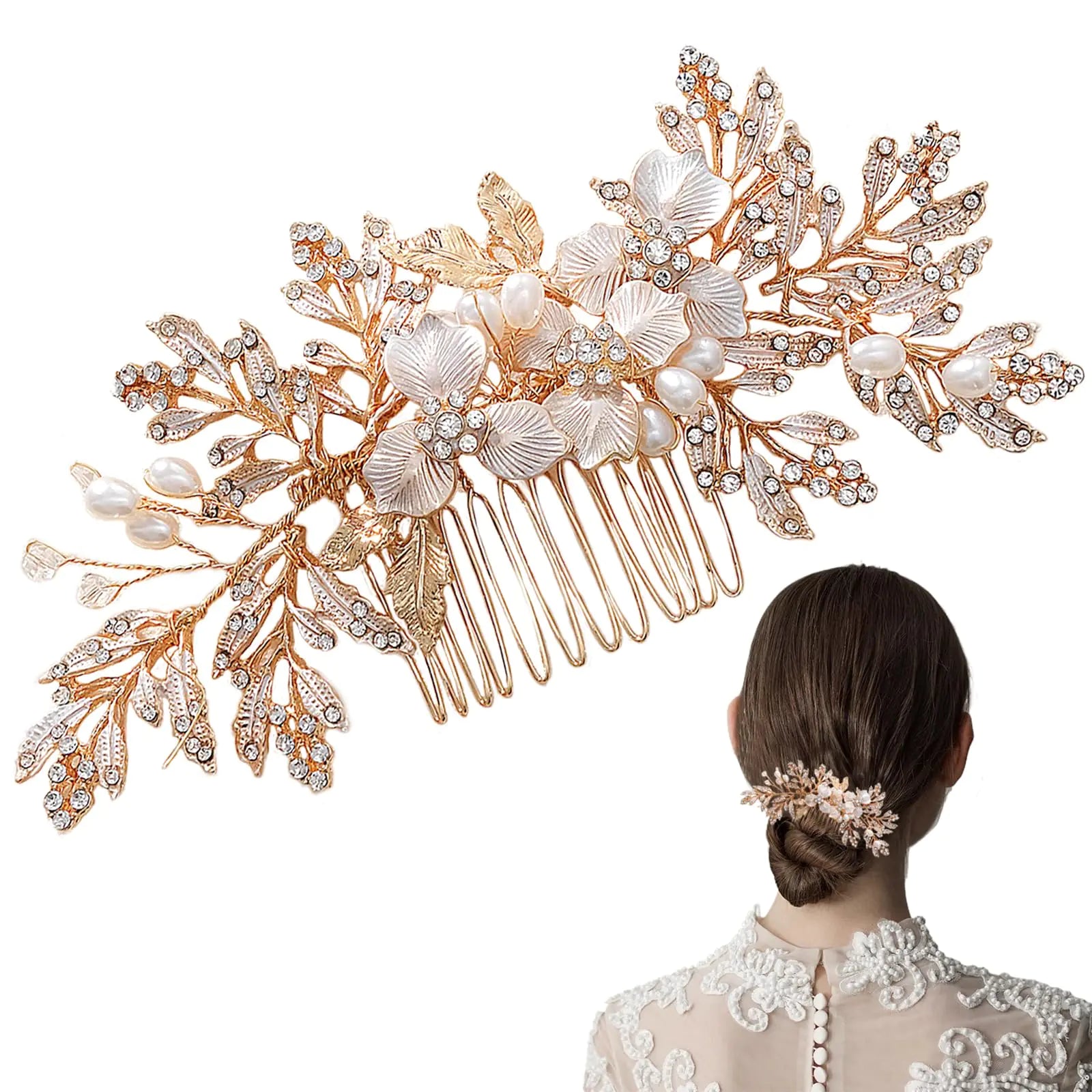 Rhinestone Handmade Wedding Hair Comb Leaf Bridal Headpieces Pearl Wedding Gold Side Combs for Women Girls Bridal Bridesmaid Hair Comb Wedding Prom Birthday Party Hair Accessories (Gold)