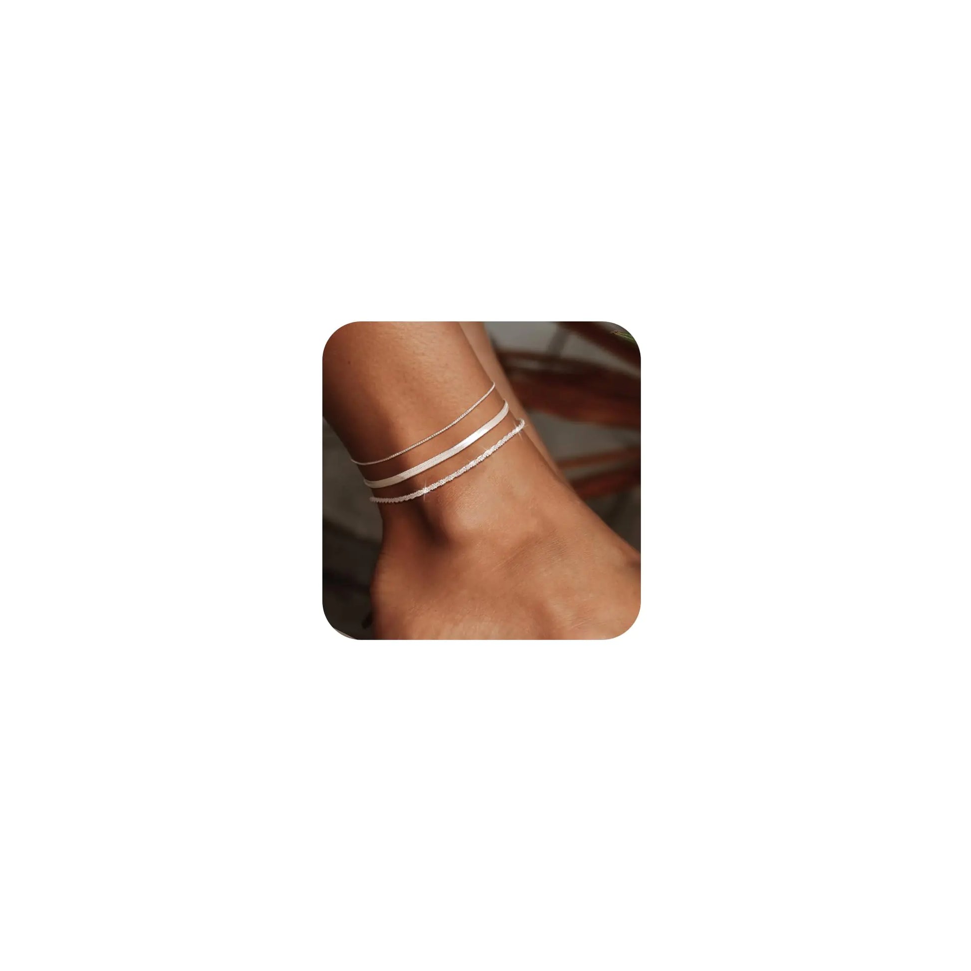 Risamil 3Pcs Silver Ankle Bracelets Layered Anklets for Women Waterproof Dainty Herringbone Box Sparkle Chain Anklet Set Jewelry Gift