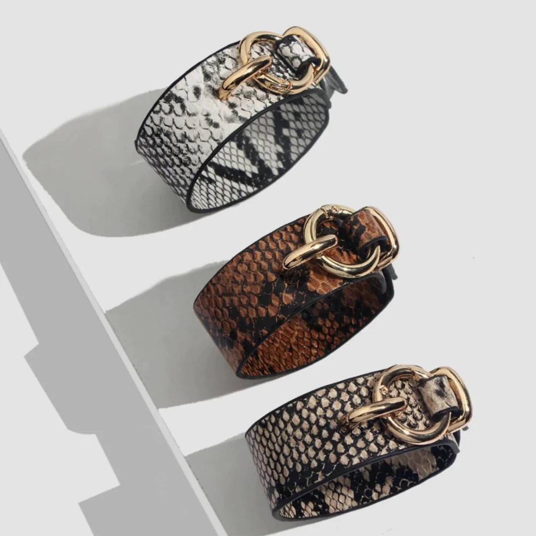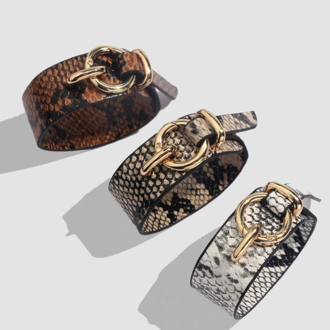 The animal print must-have bracelet. Fun design and very easy and adjustable closure. Vegan leather, imitation snakeskin. Gold plated adjustable closure for a perfect fit! Available in Brown, White, and Cream.