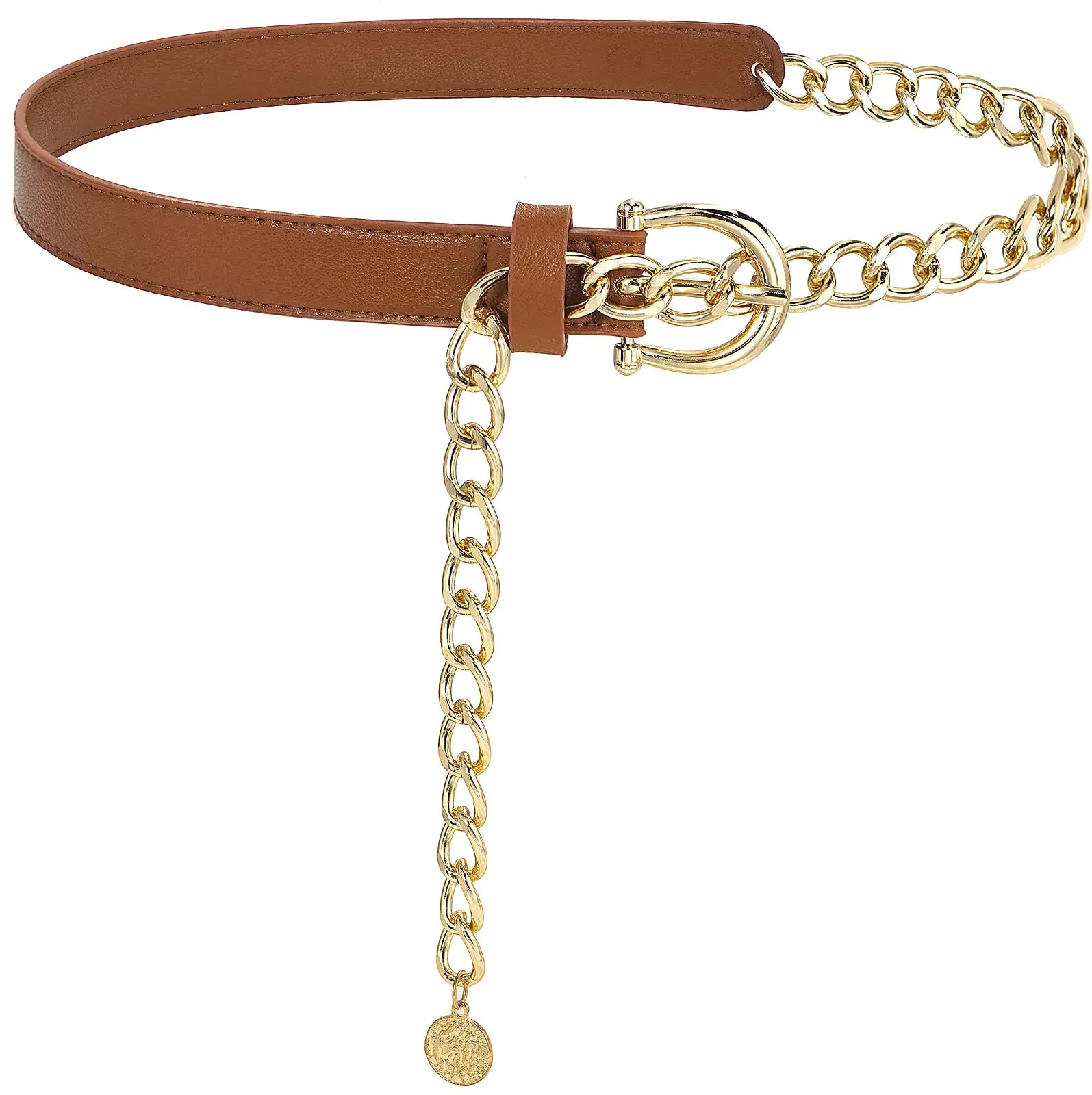 Suyi Women PU Leather Belt Waist Chain Belt for Dresses 150CM Brown Gold
