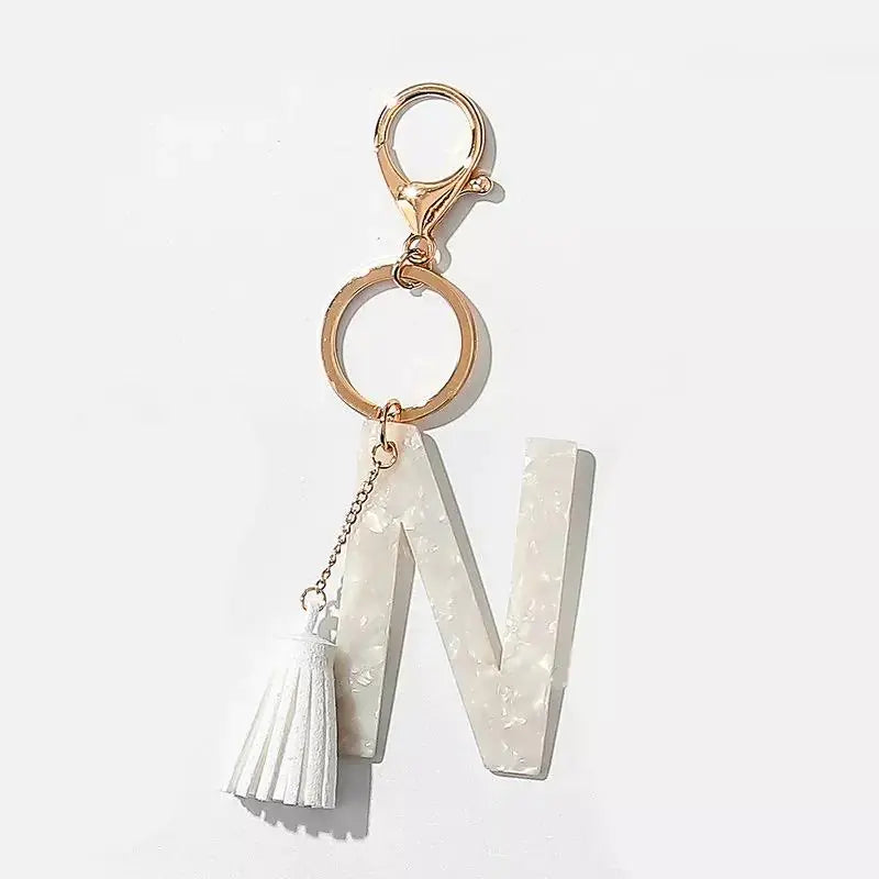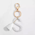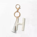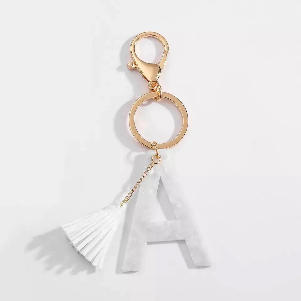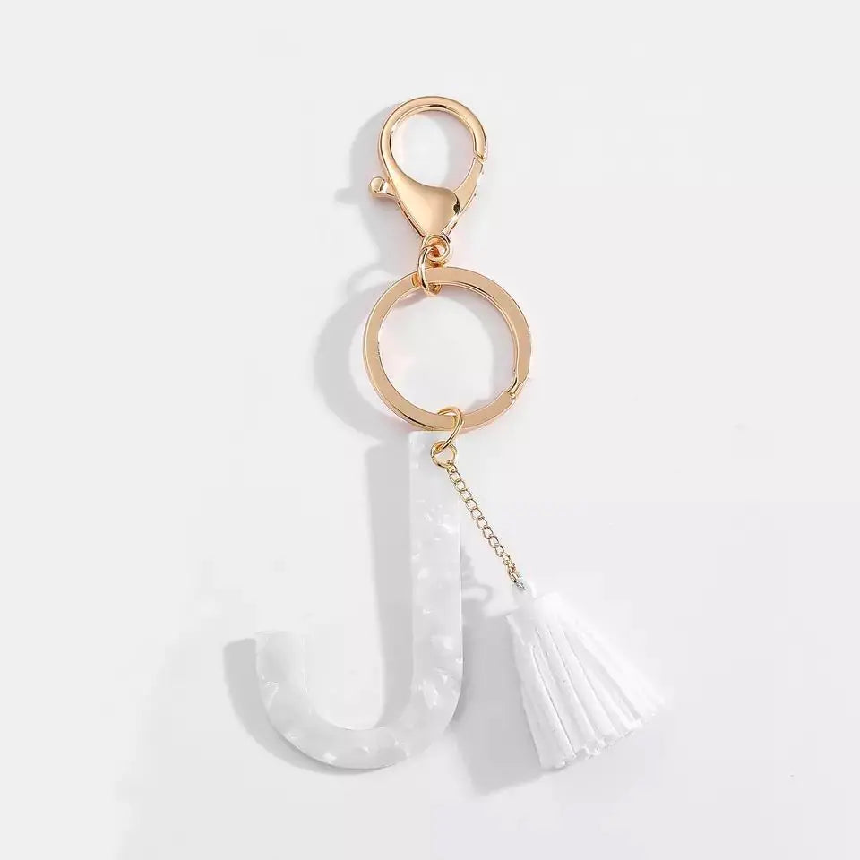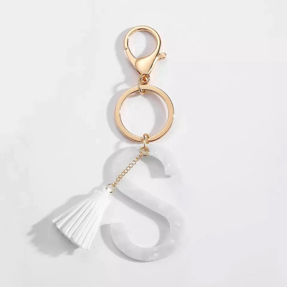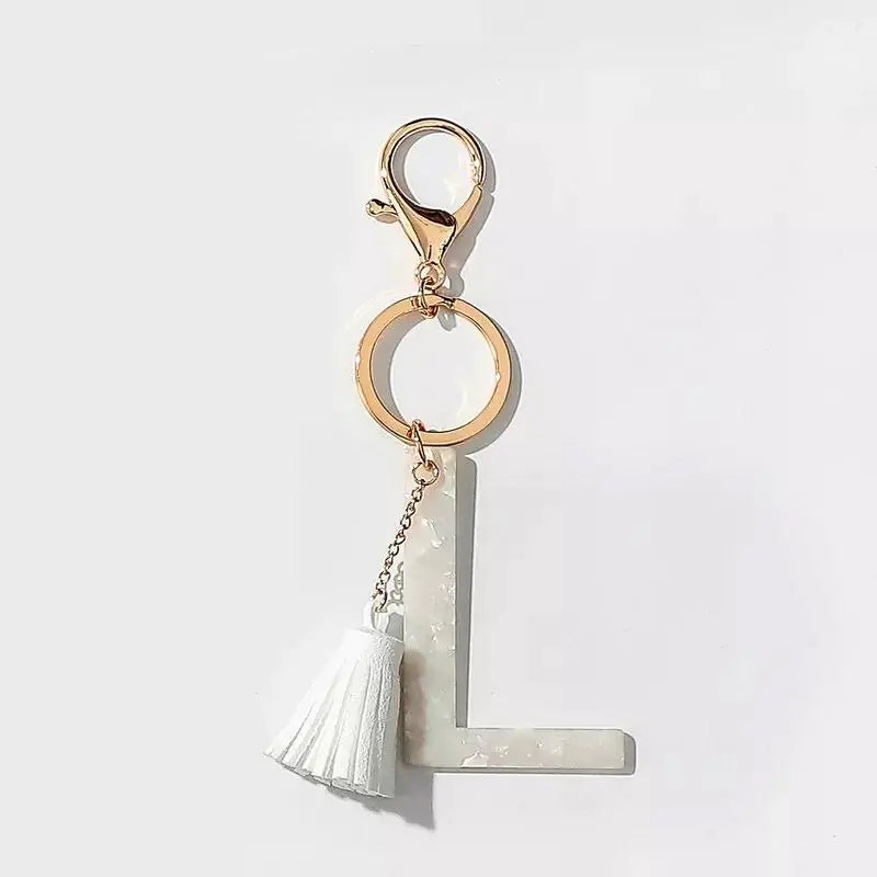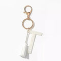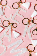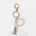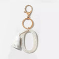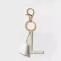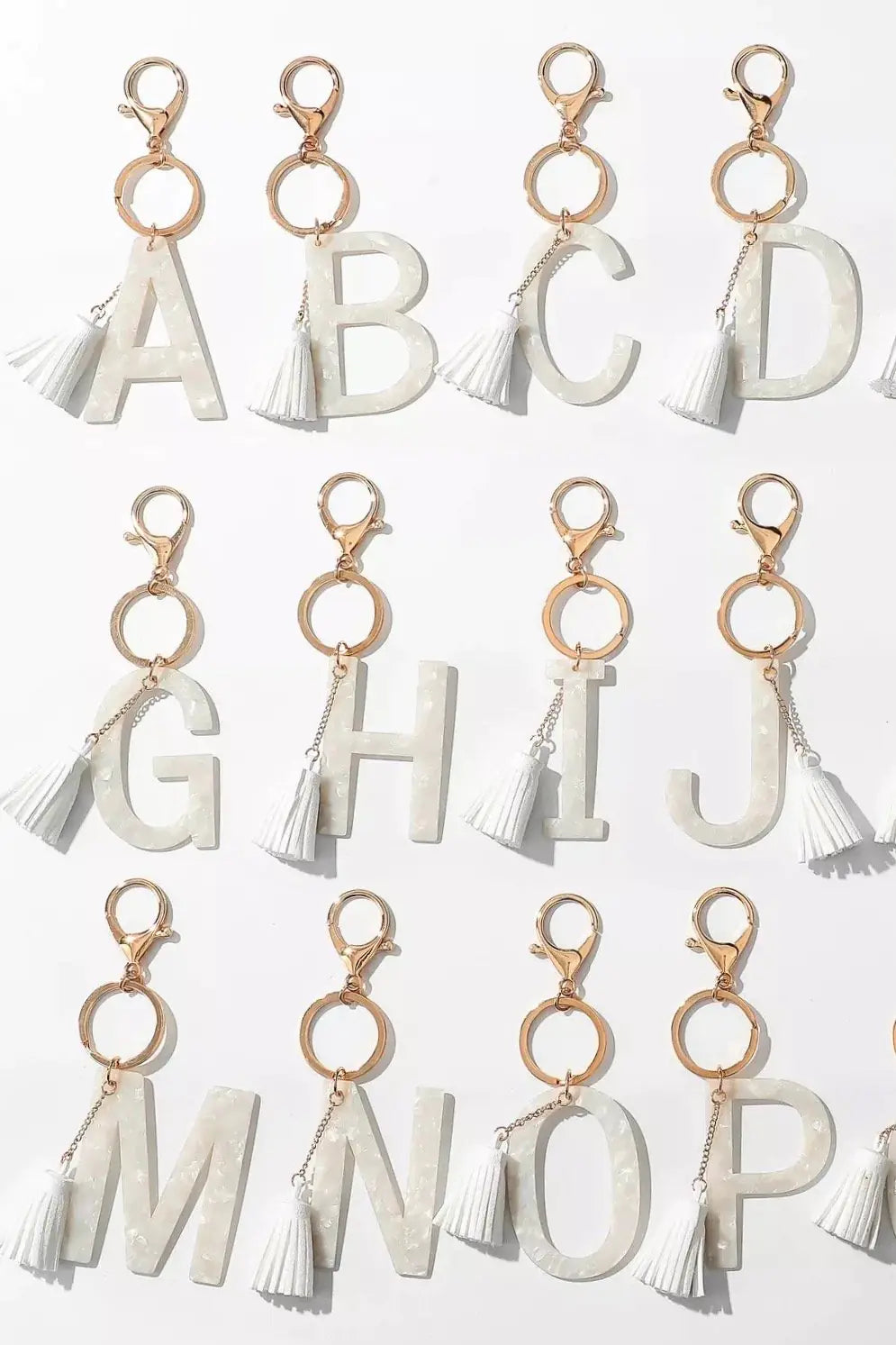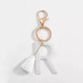 Clean and chic initial key chain complemented with a crisp white tassel.