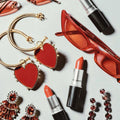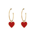 Dangling single red enamel heart earrings in gold hoop.